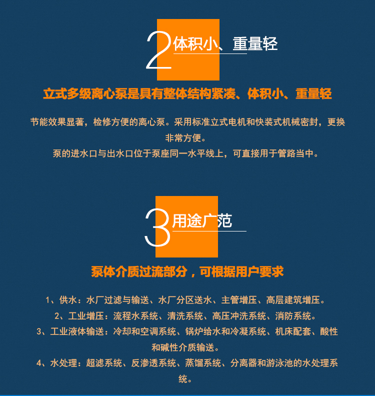 ·多級泵的進水口與出水口位于泵座同一水平線上,可直接用于管路當中。