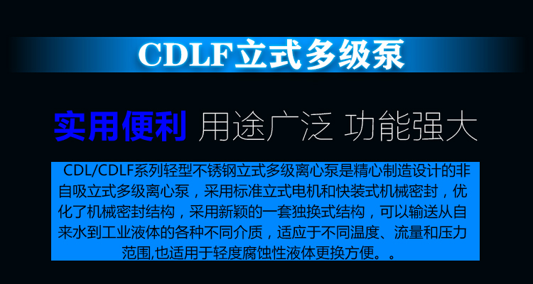 CDL/CDLF系列輕型不銹鋼立式多級離心泵是精心制造設計的非自吸立式多級離心泵,采用標準立式電機和快裝式機械密封,優化了機械密封結構,采用新穎的一套獨換式結構,可以輸送從自來水到工業液體的各種不同介質,適應于不同溫度、流量和壓力范圍,也適用于輕度腐蝕性液體更換方便。